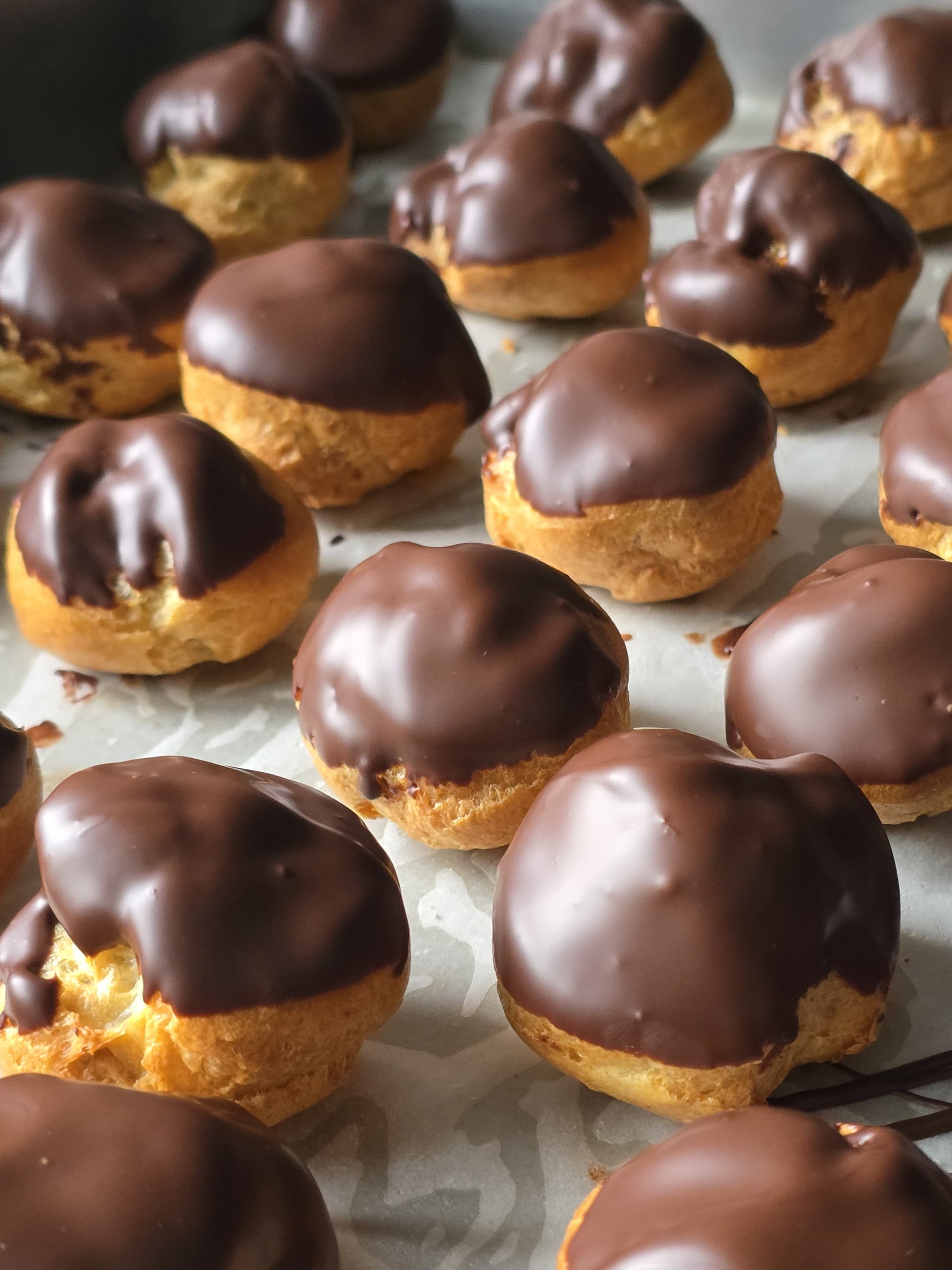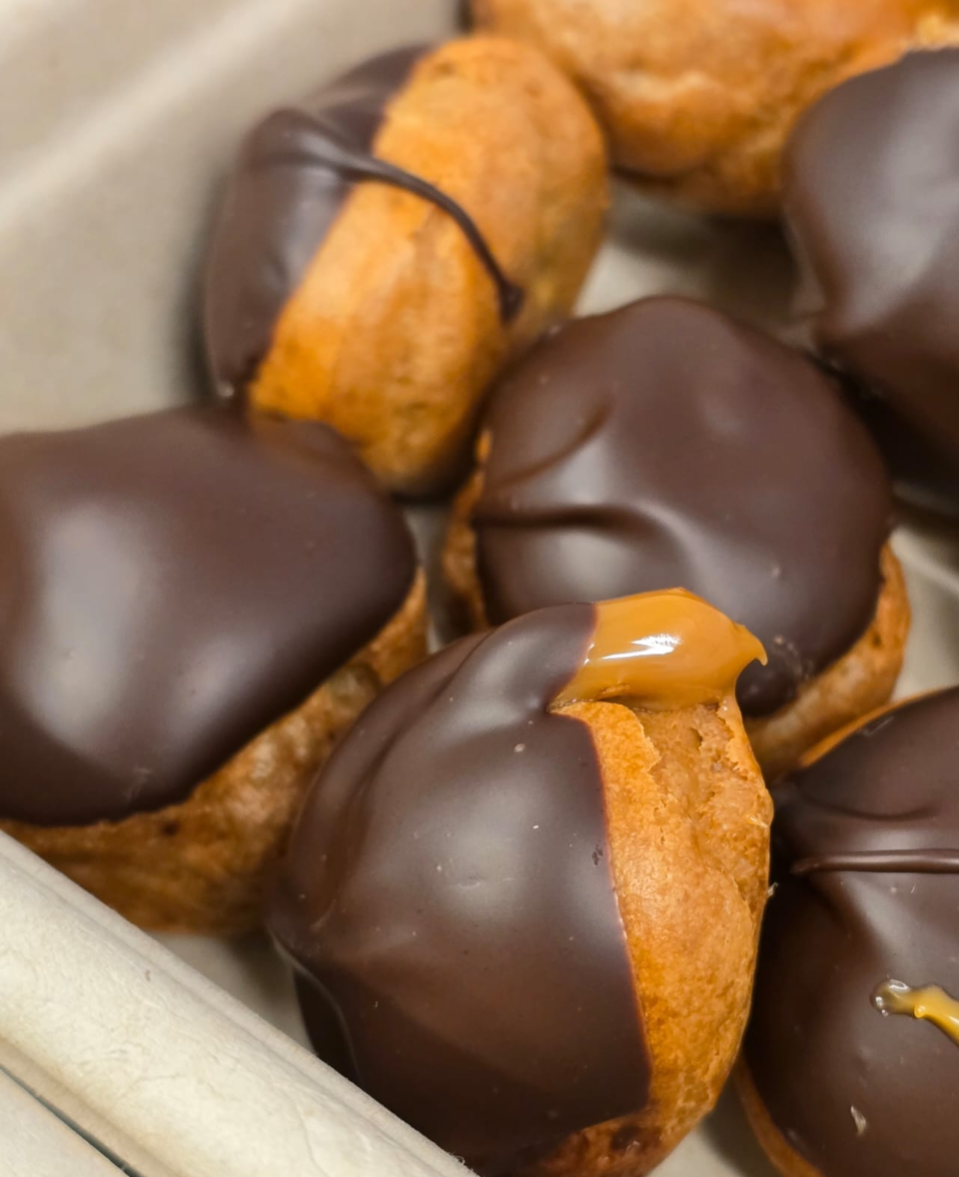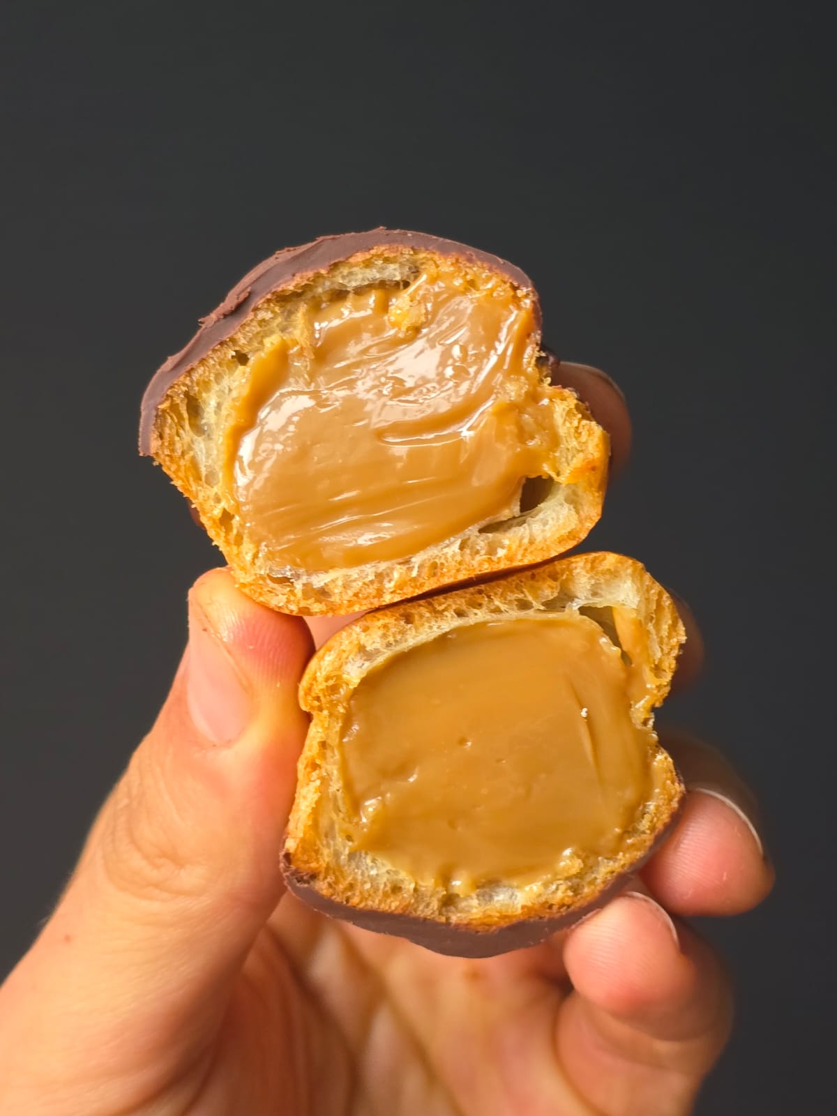 Brazilian profiteroles filled with Dulce de Leche and covered in Belgian dark chocolate.